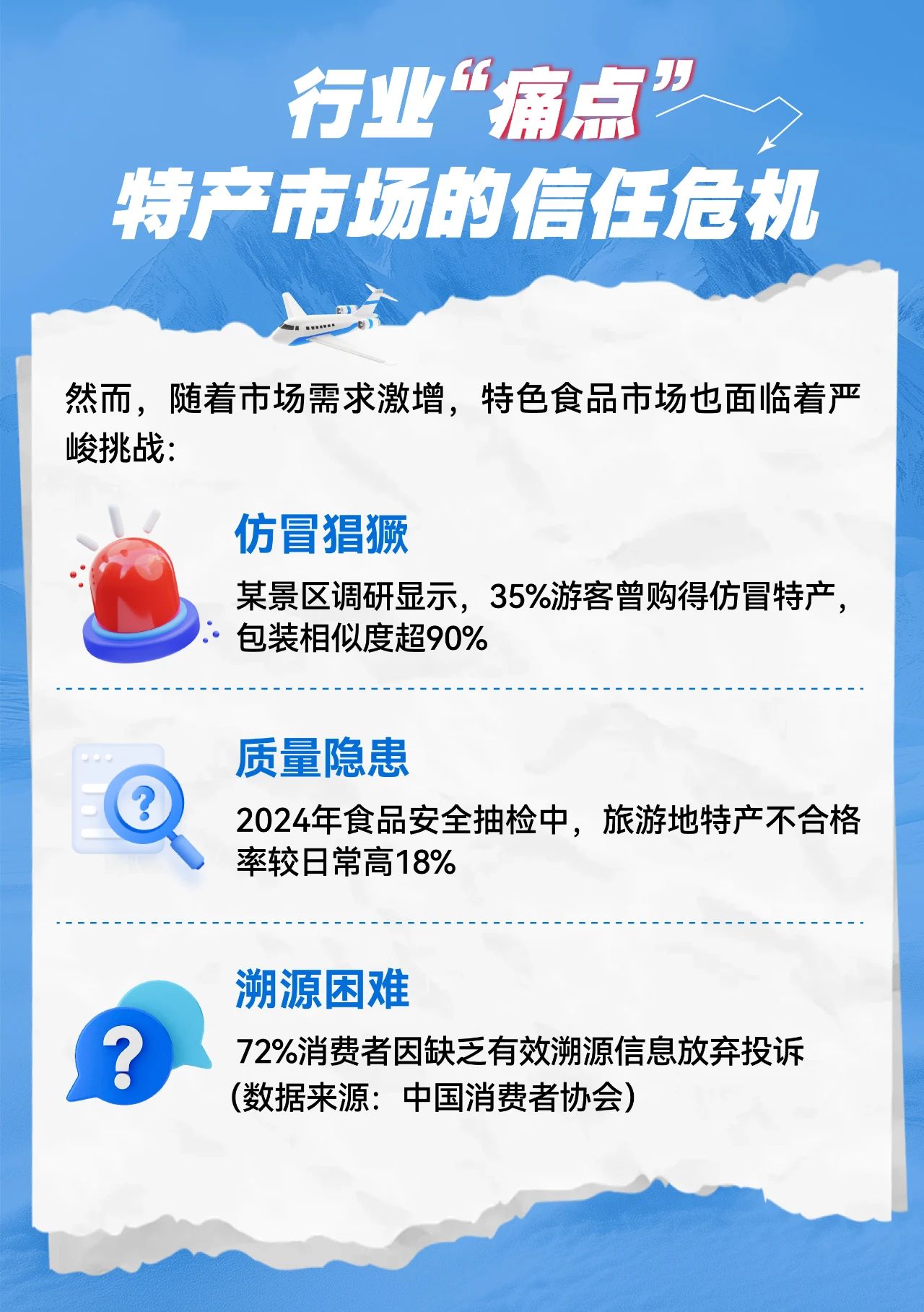 当前特色食品市场乱象已形成"劣币驱逐良币"的恶性循环。游客满怀期待购买的地方特产,常常遭遇货不对板甚至"三无产品"的困扰,不仅严重损害消费体验,更让诚信经营的优质品牌蒙受不白之冤。传统防伪手段如普通二维码标签已形同虚设——易仿制、难辨别,根本无法满足现代市场监管需求。如何让特色食品安全在市场上“透明化”,让消费者一眼识别正品,成为品牌保护和市场监管部门亟待解决的关键难题。