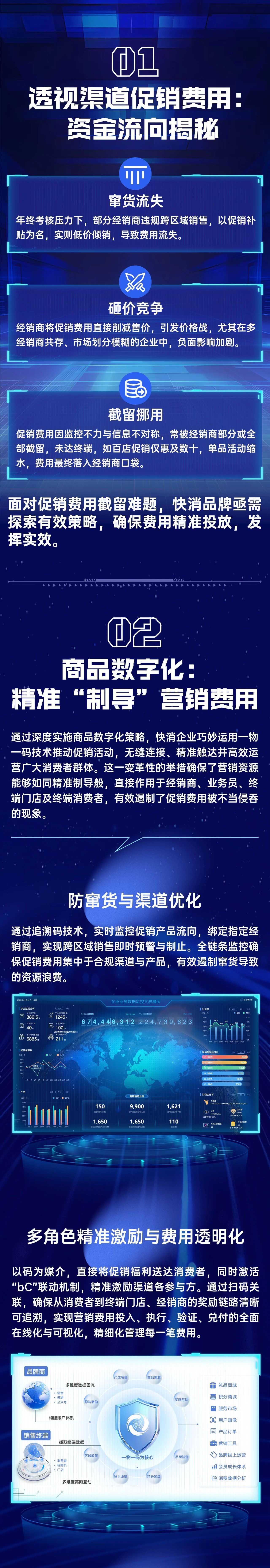 量子云码数字营销方案,凭借全场景个性化定制的智慧,实现线上与线下全域一体化协同作战。它整合了多元化的营销策略,能够支持消费者互动、渠道优化及终端促销活动的同步推进,以多样化的营销形式激发市场活力。通过费用的精准投放,量子云码显著提升费用使用效率,筑起坚固防线,有效遏制费用流失,确保每一笔投入都能发挥最大价值,强力驱动销售转化,助力企业实现从流量汇聚到销量提升,再到市场份额增长的华丽蜕变。