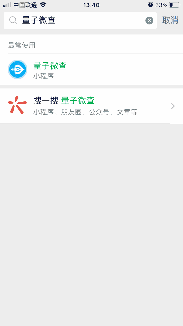 打开微信,下拉搜索“量子微查”,进入小程序,点击屏幕下方开始扫码按钮,对准量子云码,即可扫码获取产品信息。