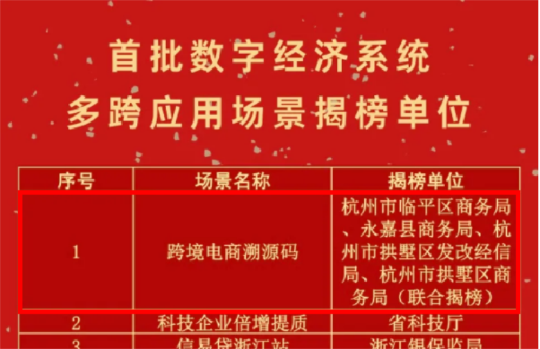 今年5月,浙江省在首批数字经济系统多跨应用场景“揭榜挂帅”揭榜大会上公布,跨境电商溯源码成为第一个应用场景,由浙江省商务厅负责牵头,杭州市临平区商务局、永嘉县商务局、杭州市拱墅区发改经信局、杭州市拱墅区商务区联合揭榜,将有效打击假货走私货市场。