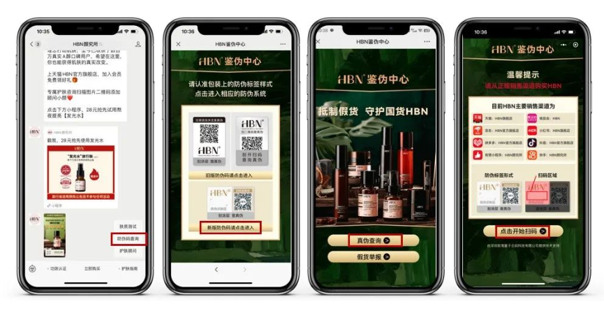 前言:化妆品行业是一个刚需、高频的消费市场。仅2022上半年化妆品零售企业新注册数量达174.1万家,据国家统计局数据,2021年1-11月份,化妆品类零售总额3678亿元,同比增长15.3%。巨大的利润空间使其成为假冒伪劣的重灾区,不仅侵害了品牌形象与消费者权益,更阻碍了品牌价值提升和未来发展。在机遇与挑战并存的背景下,化妆品牌想要脱颖而出,需要不断敏锐把握市场动向,通过数字化转型快速推进品牌价值提升。量子云码物一码载体追溯技术,作为数字化升级的强有力“抓手”,以自主核心独立算法把产品与新一代安全防伪技术结合为品牌保驾护航,已为中国排名前10名的化妆品牌诸如HBN、百雀羚、三草两木、珂拉琪、稀物集、欧诗漫等提供了整体数字化解决方案,实现品牌保护的同时优化品牌整体业务环节,构建跨平台的品牌影响力。HBN是诞生于2019年的中国功效护肤品牌代表之一,致力成为能与国际大牌相媲美的国货护肤品牌。今年天猫618,HBN成交额继去年双11之后再次破亿,全周期总成交达到1.49亿元,同比去年618实现翻倍增长,仅仅3年靠口碑驱动成为抗老黑马品牌。随着HBN品牌市场和渠道的不断扩大,产品假冒伪劣现象频发。此前,HBN采用公众号二维码+防伪码的防伪方式,由于二维码易被复制伪造、破损25%不可识读等缺陷,山寨假货情况并未得到缓解,一些假货产品不仅在包装、商标上与正品高度相似,同时还会从进货渠道、防伪查询网站、产品文案设计等多个维度造假。